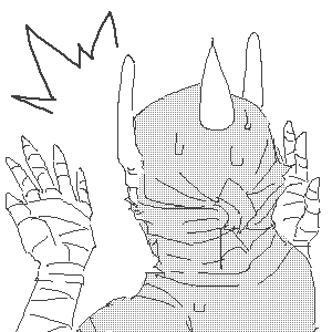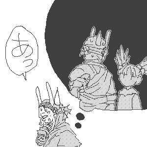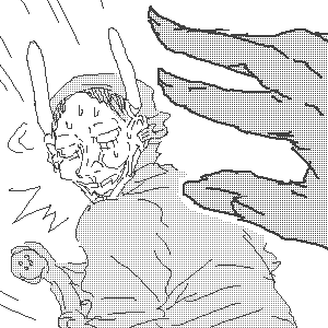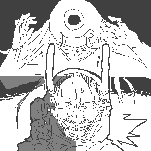 (138) 『ボク、勝手に動くハンニャーマン。 手下Dの見えない視線に圧力を感じ、 汗がだらだらと流れてきたのサ。 「あの、ボクは本当に覚えてなくて…、 それに、あれは変な世界だったから……」 「…ハンニャーマン。俺ははっきりと 見たんだ。お前のめ……… ……あっ!」 手下Dが言い終わる前に……、 ボクは思いっきり逃げたのサ。 背後で、手下Dの叫び声が響いてるけど、 …ひょーさんは全く無反応なのサ。 ……多分、気遣いじゃなくて 興味がないだけなのサ…うん…』 | |