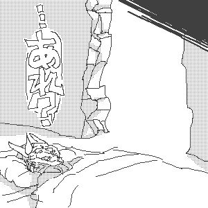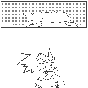 (135) 『ボク、更に予想外ハンニャーマン。 大切な面が、悪魔目玉によって外れた ………はずだった。 ボクは、気づくと布団の中にいたのサ…。 「……あれ?えっ…?これは……。 あっ!もしかして今までの夢…… …じゃ、ないか。 思いっきり壁壊れてるし…」 (じゃあ、元の世界に戻った…? でも、だったら何で布団の中に…) 「やっと起きたカ」 「!」 混乱してると、今、最も頼れる人の声が 聞こえてきたのサ』 | |